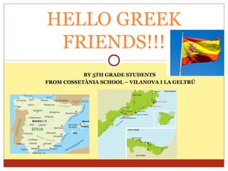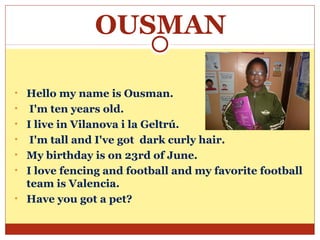 This document contains introductions from 15 students from Cossetània School in Vilanova i la Geltrú, Spain. Each introduction includes the student's name, age, hometown, birthday, hobbies and interests, physical description, and family members. The students ask questions at the end such as "Do you have a pet?" or "What is your favorite soccer team?" to encourage interaction with readers.