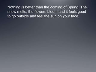 The document presents various English idioms related to spring. It begins by stating that spring is a time when the snow melts, flowers bloom, and it feels good to go outside in the sun. It then provides definitions and examples for over a dozen spring idioms, including "no spring chicken" meaning rather old, "put a spring in one's step" meaning to feel happy, and "spring fever" referring to a feeling of restlessness as the weather warms up in spring. It closes by quoting Charles Dickens saying spring is when it is summer in the sun and winter in the shade.