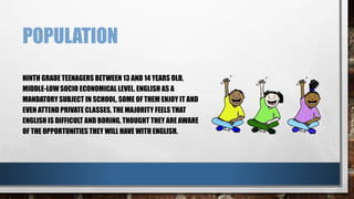 This document discusses a population of ninth grade teenagers between 13-14 years old from middle-low socioeconomic levels. While some enjoy English class and attend private lessons, the majority finds English difficult and boring, though they recognize future opportunities it provides. The institution is a private school called La Salle de Bello with average English levels compared to similar schools. After working on a blog, students will be able to compare and describe different cities around the world to cities in Colombia using comparatives and superlatives. The blog resources will include information, pictures, videos and activities to practice tools like comparatives and superlatives as well as music from various cities.