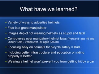 This document discusses different methods of advertising bicycle helmets and the controversy around mandatory helmet laws. It notes that while helmet advertising sometimes uses fear tactics, focusing only on helmets for safety is misguided. A better approach incorporates infrastructure improvements and education to encourage proper riding techniques, as helmets alone do not prevent accidents with vehicles.
