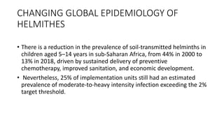 The document discusses the changing epidemiology of soil-transmitted helminths in Sub-Saharan Africa, highlighting a significant decrease in prevalence among children due to preventive measures, although some regions still exceed infection thresholds. It emphasizes the complex immune modulation by helminths, which can impact responses to various diseases such as tuberculosis, malaria, HIV, and metabolic disorders. The document also details the mechanisms by which helminths manipulate host immune responses to enhance their survival and suggests potential implications for public health interventions.