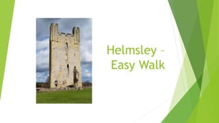 This walk through the countryside around Helmsley involves no steep climbs and follows fields and riverside paths. The gentle ramble can be combined with a visit to Helmsley Castle located near the start/end of the walk. The town of Helmsley has many cafes and places to eat as well as attractions like a Bird of Prey center and Walled Gardens to explore. Driving directions are provided from Middlesbrough to the long stay car park where the walk begins, passing through scenic Sutton Bank. The walk description provides a detailed route alongside rivers and through fields returning to Helmsley.