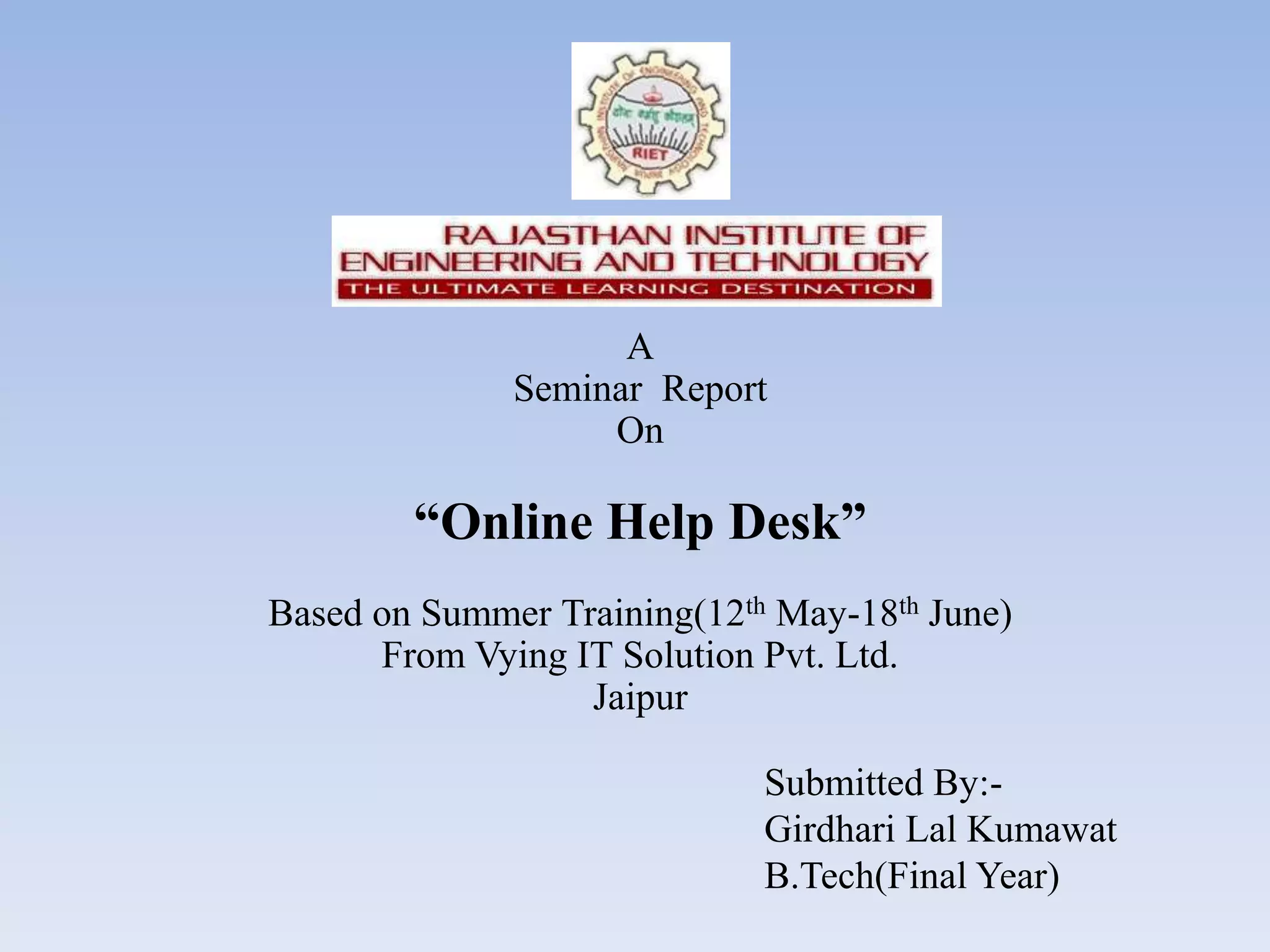 The document discusses an online help desk project created using ASP.NET and SQL Server that allows users to submit technical queries, assigns queries to be solved, and provides reports on the status of queries. It describes the components used including Visual Studio 2005, C#, and SQL Server 2005 and provides an overview of the various pages created for the project such as forms for login, creating users, submitting queries, and viewing solutions and reports.