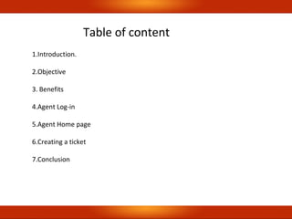 This document provides information about setting up and using a help desk system called GLPI. It discusses the benefits of a help desk for end users, agents, and management. It outlines the agent login process and describes the home page and ticket creation features. The objective is to track tickets, requests, issues, response times and assign agents for better support. Users can log incidents or requests, provide details, upload files and expect responses within timeframes. Recurring issues will be prevented through analysis of ticket information in the system.