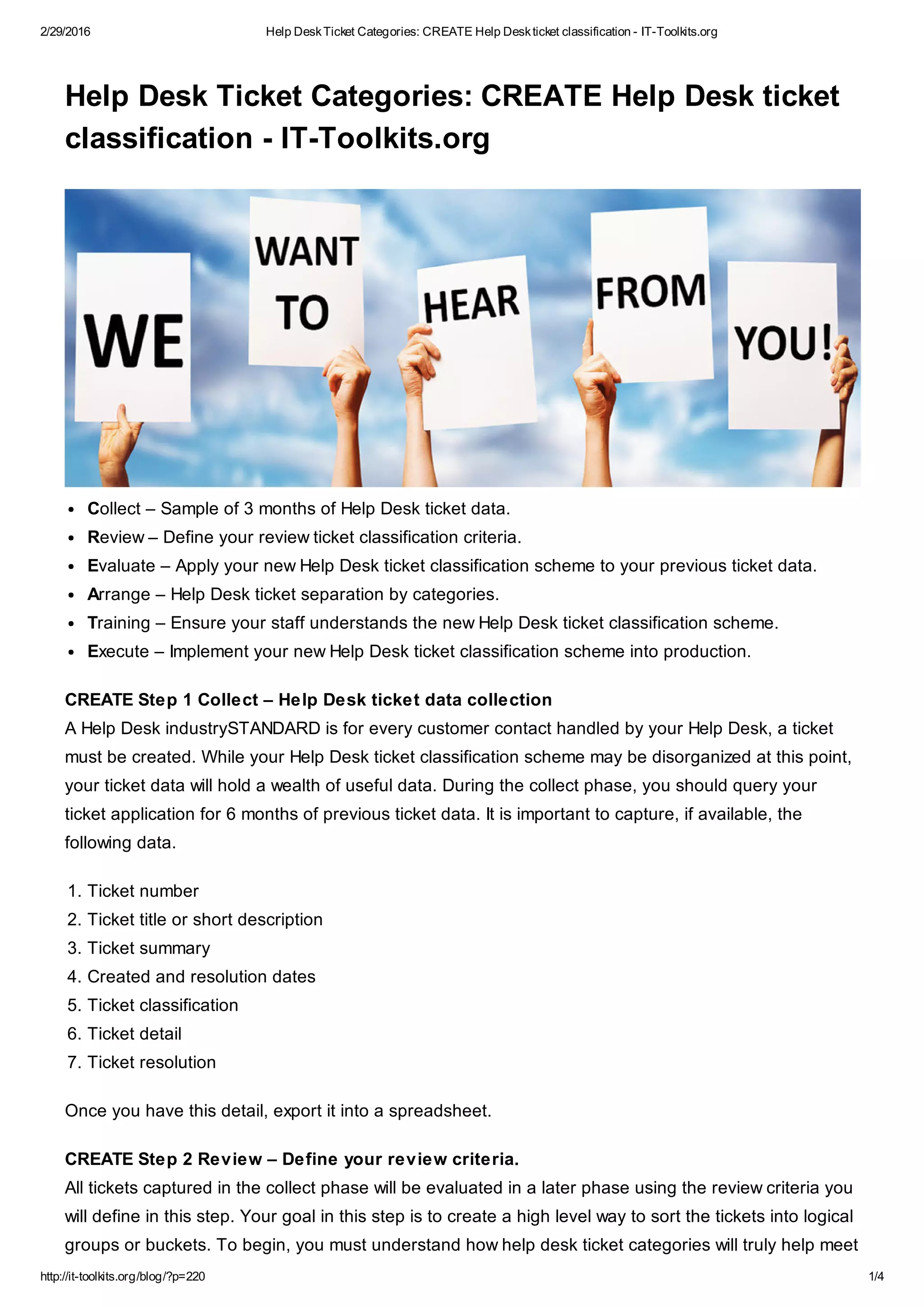 The document outlines a structured approach to creating a help desk ticket classification scheme through six steps: collecting data, defining review criteria, evaluating past tickets, arranging categories, training staff, and executing the classification scheme. It emphasizes the importance of a systematic ticket categorization for improving incident resolution, decision-making, and reporting. Key classifications include incident resolution, service requests, and training inquiries, organized into a three-tier system based on type, service, and product.