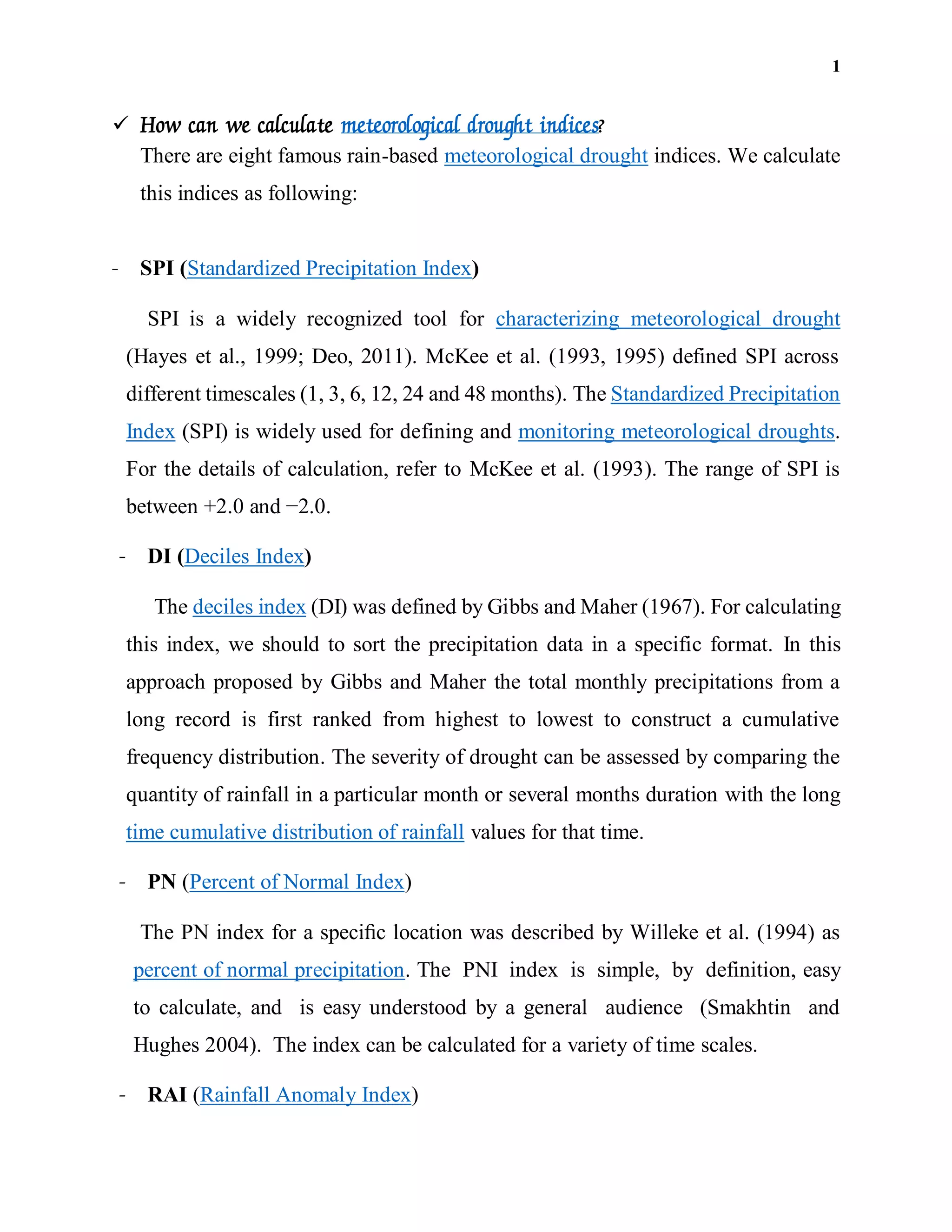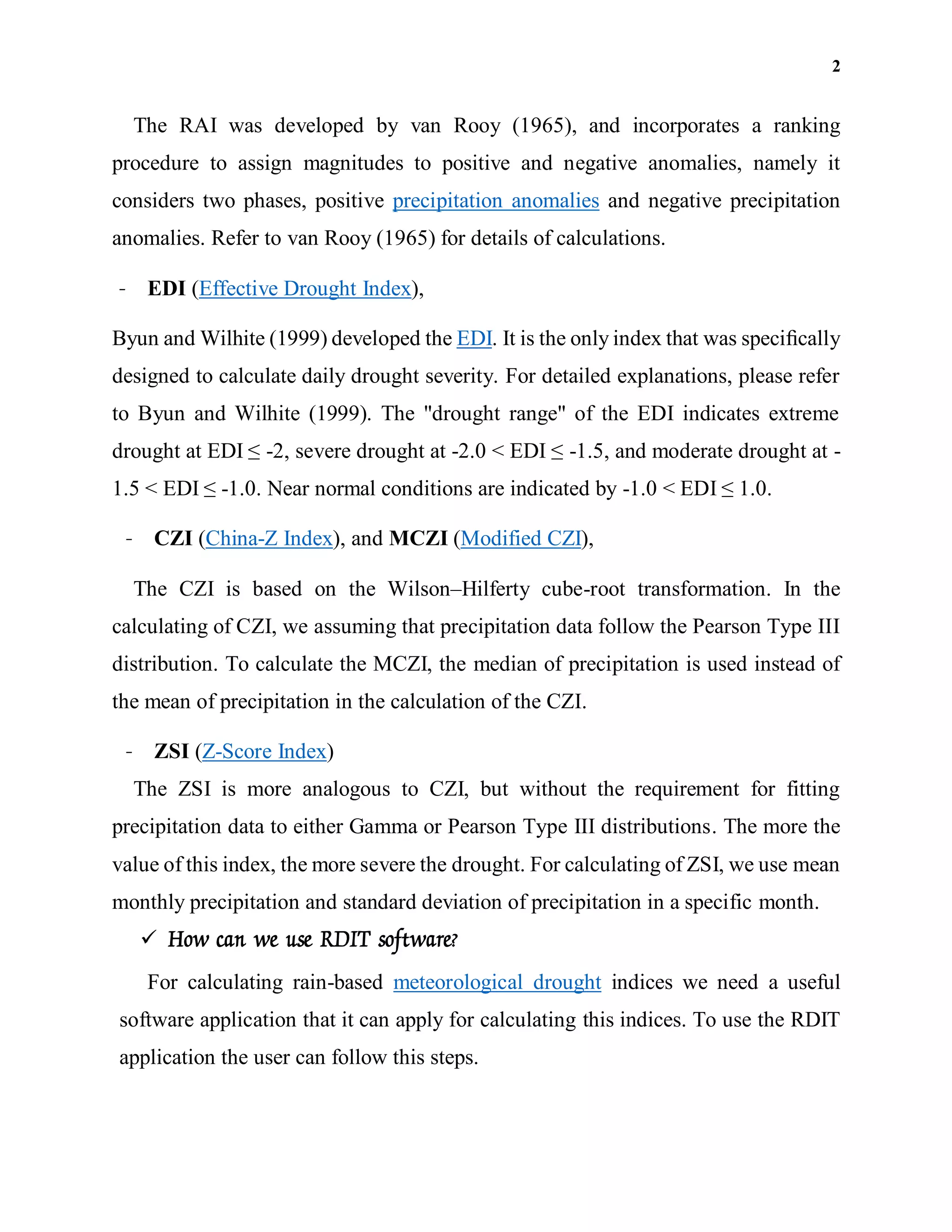 This document describes how to calculate meteorological drought indices using the RDIT software. It discusses 8 main indices: SPI, DI, PN, RAI, EDI, CZI, MCZI, and ZSI. The document then outlines the 3 step process to use RDIT: 1) open the data file and assign data properties, 2) run the model by selecting an index, time period, and frequency, and 3) view the output graph and export results. Severity thresholds can also be set to identify drought conditions. A help movie is available to guide users through each step of the process.