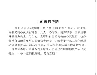 上面来的帮助 神的圣言是超然的,是“从上面来的”启示。对于饥 渴慕义的心灵大有裨益。凡人一心悔改,离弃罪恶,信靠主耶 稣基督为救主,为主的,主耶稣自己必向他的心灵显明,也必 将祂自己的喜乐平安赐给信者的心中。编者于一九三七年经历 这属灵的经历。这么多年来,本人与主耶稣属灵的奇妙交通, 一直保持不断。阅者若尚未信主,切望现在即将你整个人生交 托主,一心一意的投靠祂,是为至盼! 神的救赎 我需要救主 因为世人都犯了罪,亏缺了 神的荣耀。 罗马书 3:23 但你们的罪孽使你们与神隔 绝,你们的罪恶使他掩面不听你 们。