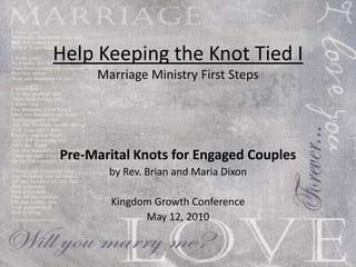 The document provides an overview of a course on establishing a marriage ministry in churches. It discusses the need for marriage ministries given divorce rates. It outlines a 5 step process to creating a marriage ministry: 1) Establish a marriage ministry team, 2) Determine objectives and goals, 3) Diagnose needs, 4) Plan work and activities, 5) Spread awareness. It also provides examples of marriage ministry curricula and discusses common issues faced by couples like finances, communication, parenting roles and more.