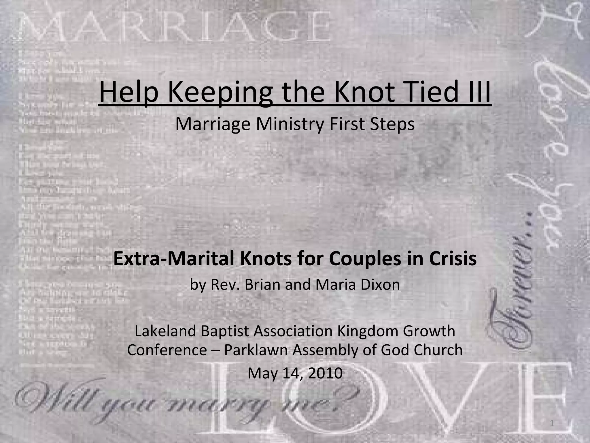 The document provides guidance for churches looking to establish marriage ministry programs. It outlines 10 steps churches can take to help couples increase their odds of marital success from 50% to 95%. These include being committed Christians, living separately before marriage, using relationship assessments, and following up after marriage. The document also discusses developing advisory teams, screening advisors, addressing affairs, and maintaining biblical stances on sex and marriage. Resources for curriculums and counseling are provided.