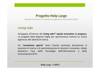 Il progetto 'Help Large' è un'iniziativa di ricerca e sviluppo finanziata dalla Regione Puglia, realizzato attraverso un approccio innovativo che coinvolge attivamente gli utenti nel processo di sperimentazione. Tra le sue finalità ci sono lo sviluppo di nuovi prodotti e servizi digitali e la promozione della salute e dell'alimentazione, attraverso strumenti come il serious game 'Cibopolis' e la 'Nephro-app'. Il progetto prevede diverse fasi, tra cui analisi di scenario, interazione con la community e prototipizzazione, con risultati in corso di sviluppo.