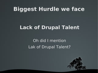 The document discusses how to help spread Drupal skills beyond existing users and help newcomers feel comfortable contributing. It suggests being welcoming to newcomers, running mentoring sessions, and explaining Drupal concepts in business terms without dumbing things down or judging skill levels, in order to both help people use Drupal and feel able to contribute.