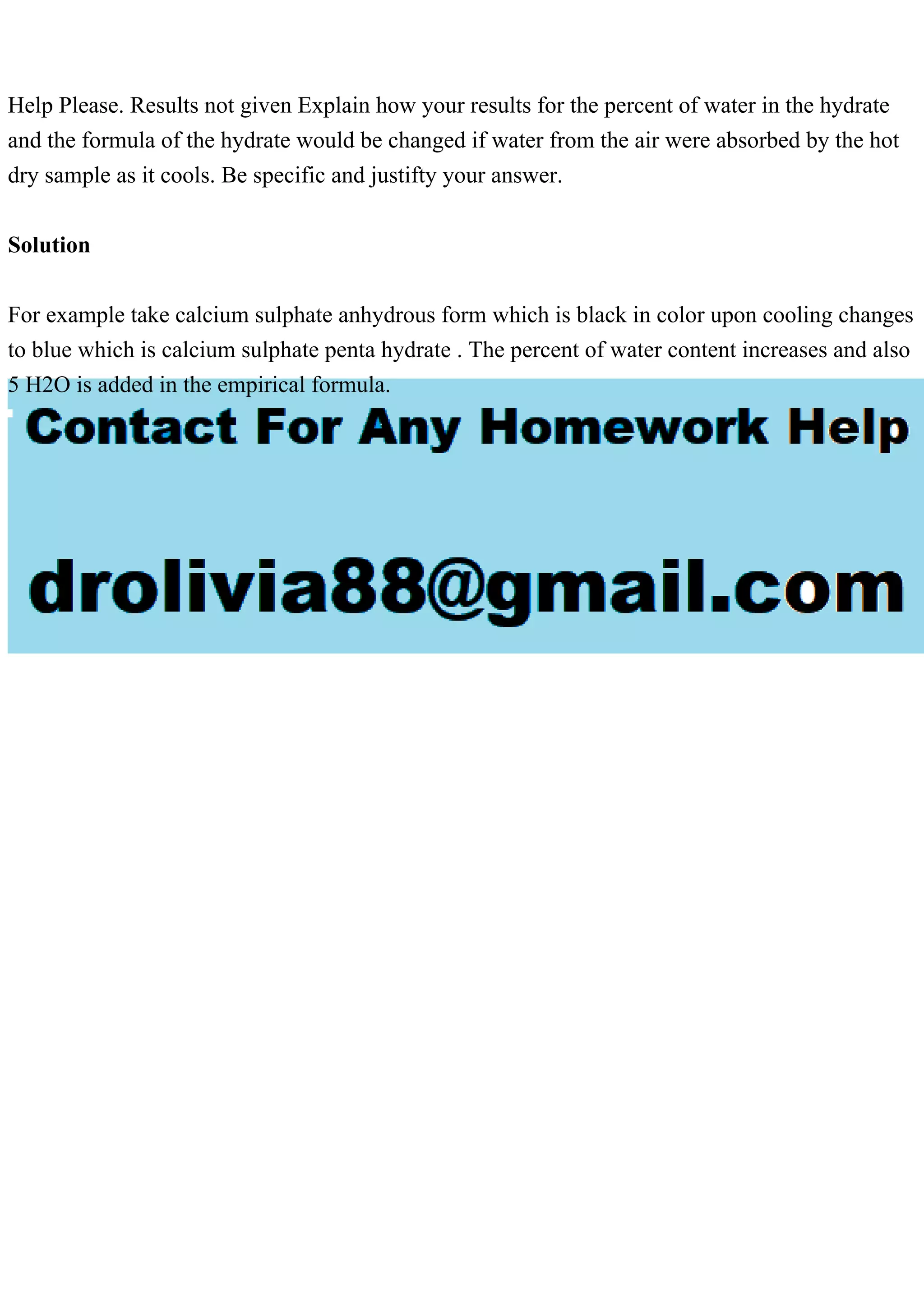 The document discusses how the results for the percent of water in a hydrate and its formula would change if moisture from the air is absorbed by a hot dry sample upon cooling. For example, anhydrous calcium sulfate turns into calcium sulfate pentahydrate, increasing the water content percentage and altering its empirical formula to include 5 H2O. This demonstrates the effect of environmental humidity on hydration states in chemical compounds.
