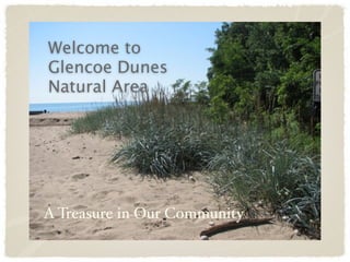 The Glencoe Dunes Natural Area is a vital public ravine environment that has faced neglect, impacting accessibility and ecological health. The document urges the community to advocate for maintenance and restoration efforts, emphasizing the importance of preserving this unique landscape for recreation, teaching, and conservation. A village board meeting is scheduled for September 15, 2011, where residents are encouraged to support safe access and partnerships for the area's preservation.