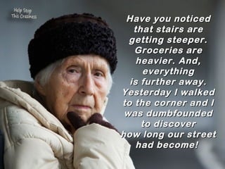 The author notices that everyday tasks have become more difficult as stairs are steeper, groceries are heavier, and distances are farther. Young people speak in whispers and don't recognize the author, while mirrors make the author look older. Clothing sizes and bathroom scales are lying, and phone books and car brakes seem designed to inconvenience the author. The author believes there is an attack underway and wants to warn others and stop the conspiracy causing these indignities.