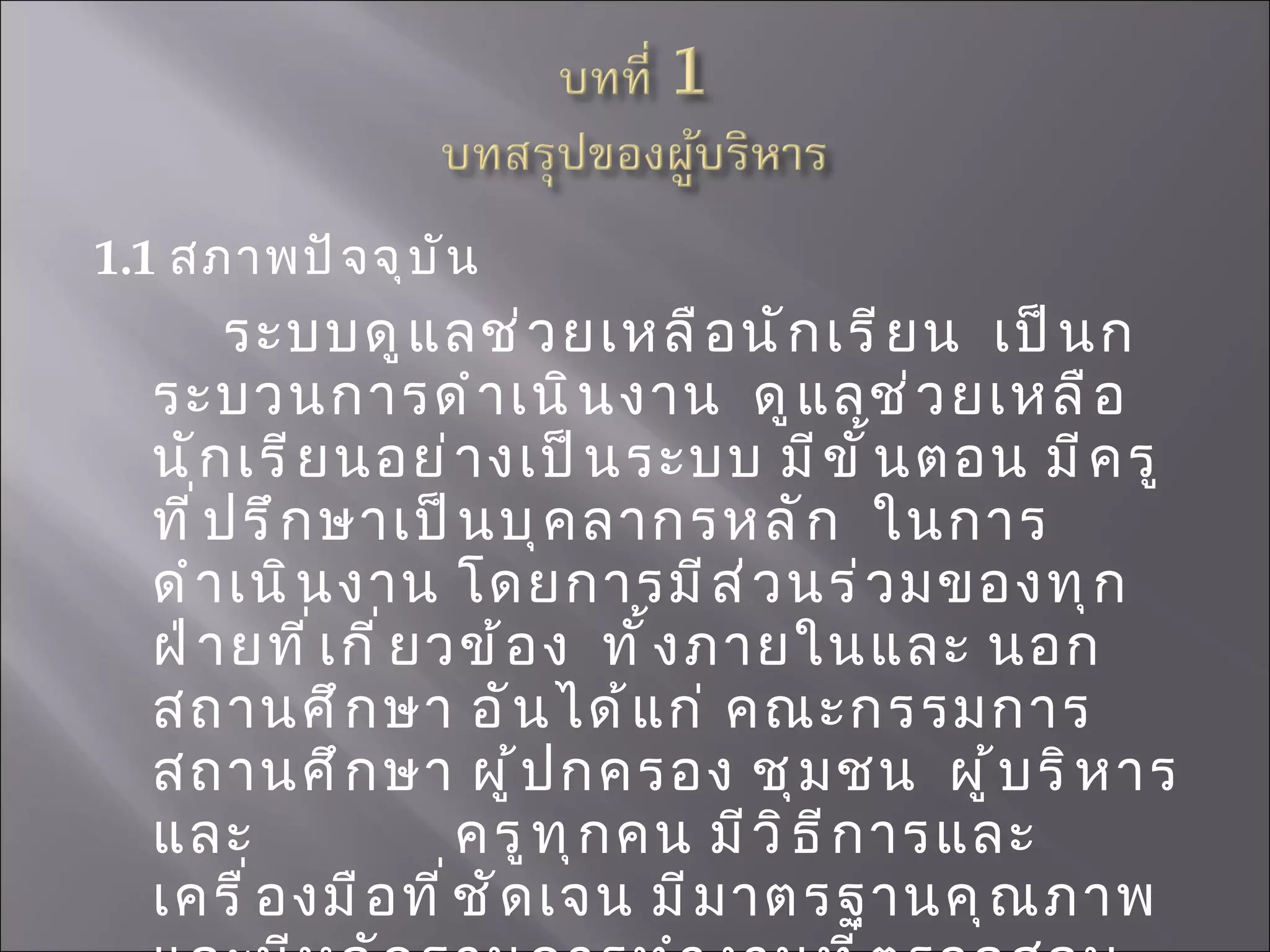 1.1 สภาพปัจจุบันระบบดูแลช่วยเหลือนักเรียน เป็นกระบวนการดำเนินงาน ดูแลช่วยเหลือนักเรียนอย่างเป็นระบบ มีขั้นตอน มีครูที่ปรึกษาเป็นบุคลากรหลัก ในการดำเนินงาน โดยการมีส่วนร่วมของทุกฝ่ายที่เกี่ยวข้อง ทั้งภายในและ นอกสถานศึกษา อันได้แก่ คณะกรรมการสถานศึกษา ผู้ปกครอง ชุมชน ผู้บริหาร และ ครูทุกคน มีวิธีการและเครื่องมือที่ชัดเจน มีมาตรฐานคุณภาพ และมีหลักฐานการทำงานที่ตรวจสอบได้ - 3.