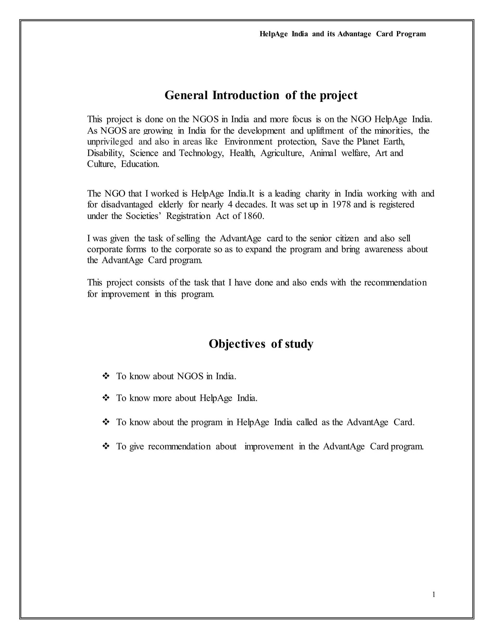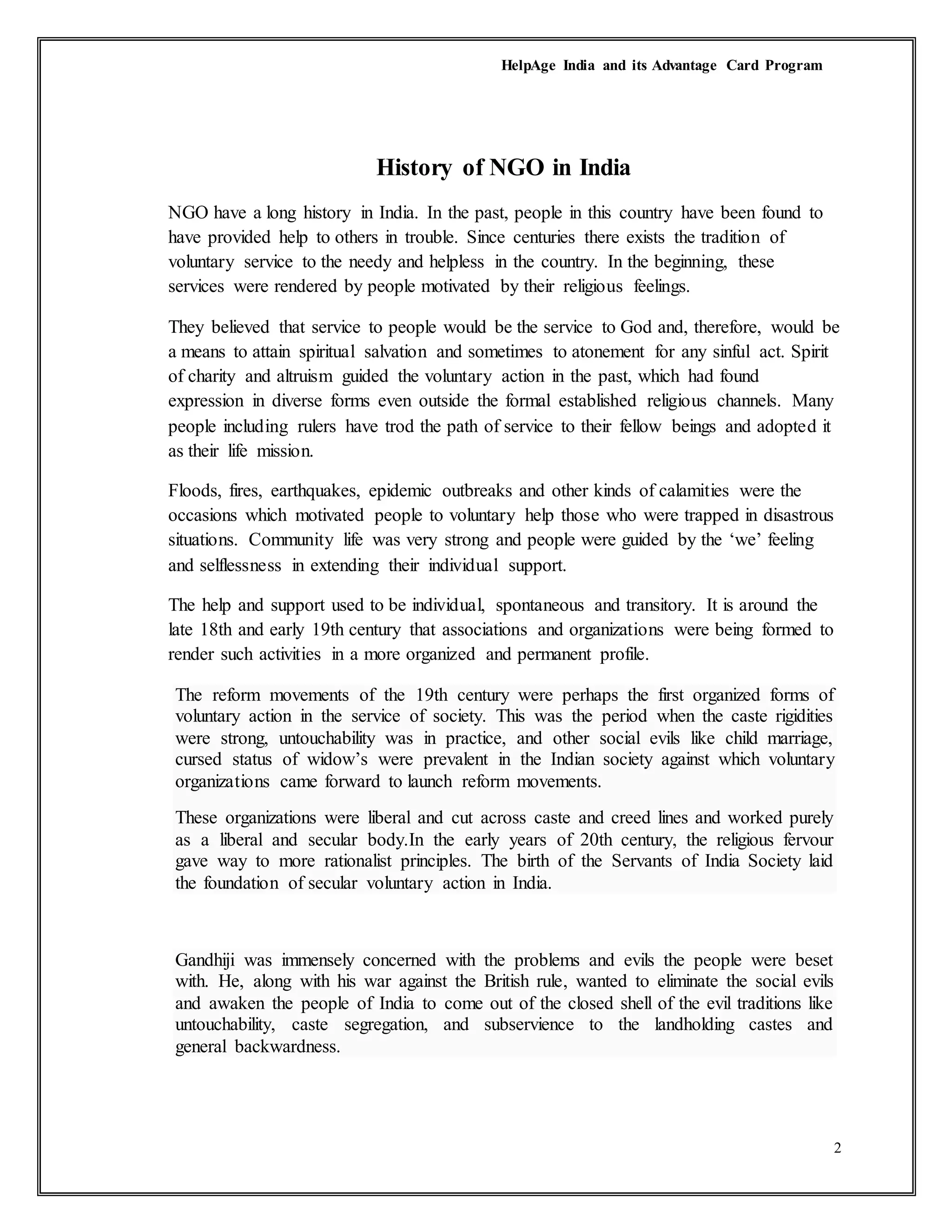 HelpAge India is a prominent NGO dedicated to supporting disadvantaged elderly individuals in India, operational since 1978. The project outlines the NGO's role in promoting the Advantage Card program aimed at providing benefits and services to senior citizens, alongside a historical context of NGOs in India and their significant impact on various social issues. Recommendations for improving the Advantage Card program are also included, emphasizing the need for greater awareness and outreach.