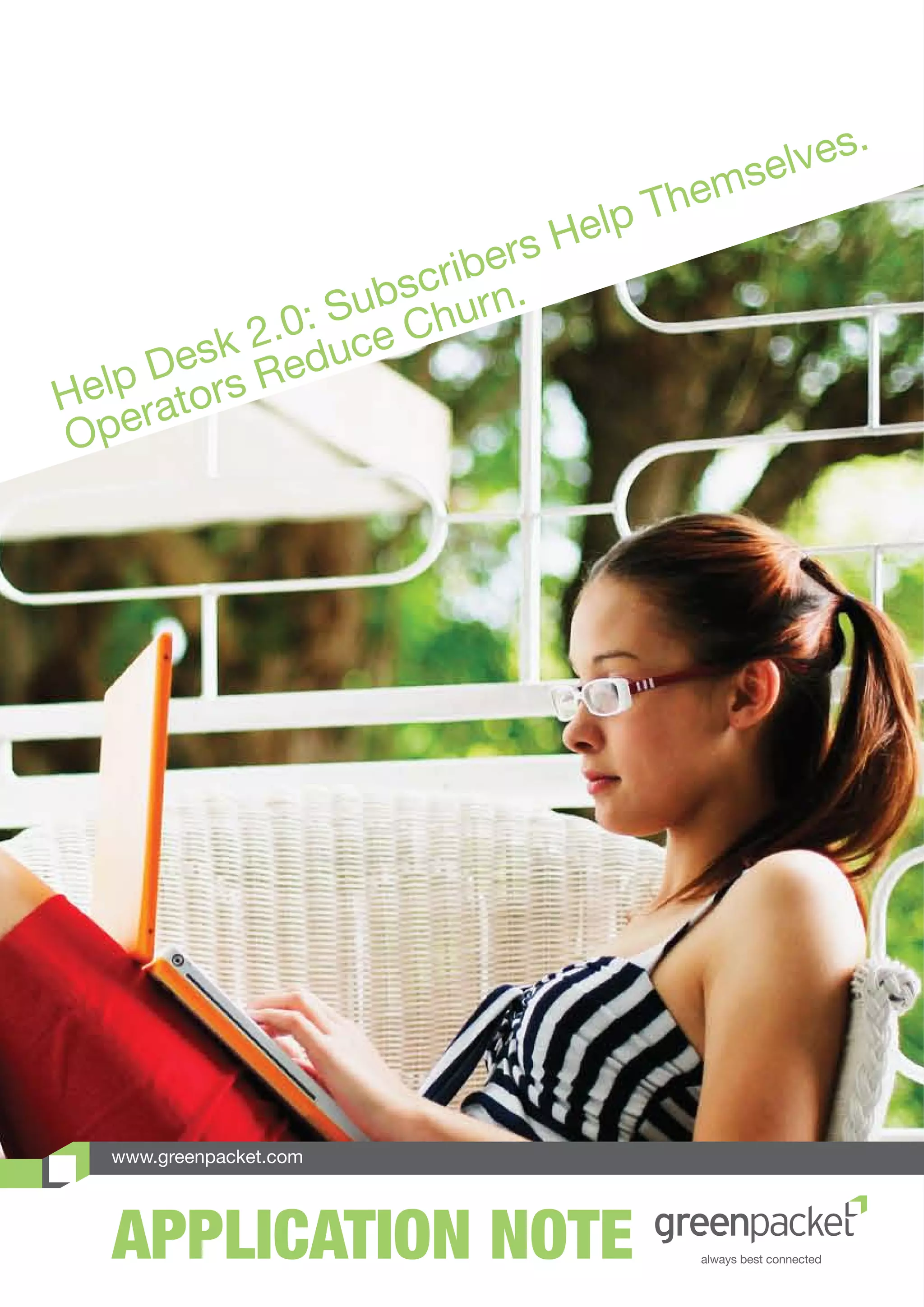 The document discusses the emergence of customer service excellence as a crucial strategy for telecommunications operators and presents an innovative approach called Help Desk 2.0, which leverages personal digital assistants for self-care among subscribers. This method aims to reduce operational costs associated with call centers while enhancing customer experience by empowering subscribers to troubleshoot issues independently. The implementation of systems like Greenpacket's Instinq Self-Healing Diagnostic System is emphasized as a way to alleviate connectivity complaints and decrease customer churn.