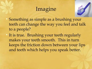 This document provides tips for staying focused and productive at work. It suggests that brushing teeth regularly can improve speech and interpersonal interactions. Maintaining good posture when sitting or standing can help one feel better and perform job duties more effectively. The document advises against slouching and recommends stretching to avoid feeling sleepy or bored. It acknowledges challenges for smokers working in non-smoking environments and suggests waiting for approved breaks if alternatives like candy are disallowed or unavailable.