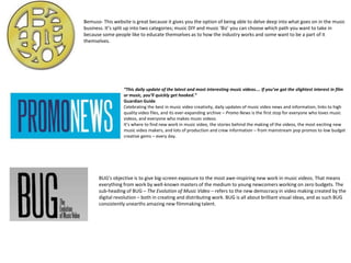 Mr. Henton showed the class several websites that could help them with their media knowledge and guidance for an assigned task. He explained each site as they cover different aspects of music videos. The student will post logos of the sites and give a brief explanation of what each offers, including Bemuso which allows exploring the music business and industry, Promo News which provides daily music video updates, news and links to high quality videos, and BUG which gives exposure to inspiring new music videos from established and newcomer directors.
