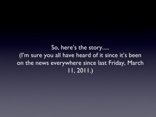 The document summarizes the effects of the 2011 Tōhoku earthquake and tsunami in Japan. It describes how the city of Sendai was devastated by the magnitude 9.0 earthquake and subsequent tsunami. Survivors were left homeless and without access to food or basic necessities. The document urges readers to help support relief efforts through donations of money, supplies, or volunteer work to help the thousands of people affected by the disaster. It provides details on donation drives being conducted by K. International School Tokyo to deliver aid to victims in Japan.