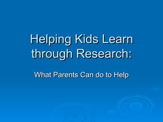 This document provides guidance for parents on helping their children with research. It discusses different types of resources available for research, including print, electronic, and primary sources. It also covers how to evaluate the reliability of websites and emphasizes the importance of teaching children to properly cite their sources and use information ethically from a young age.