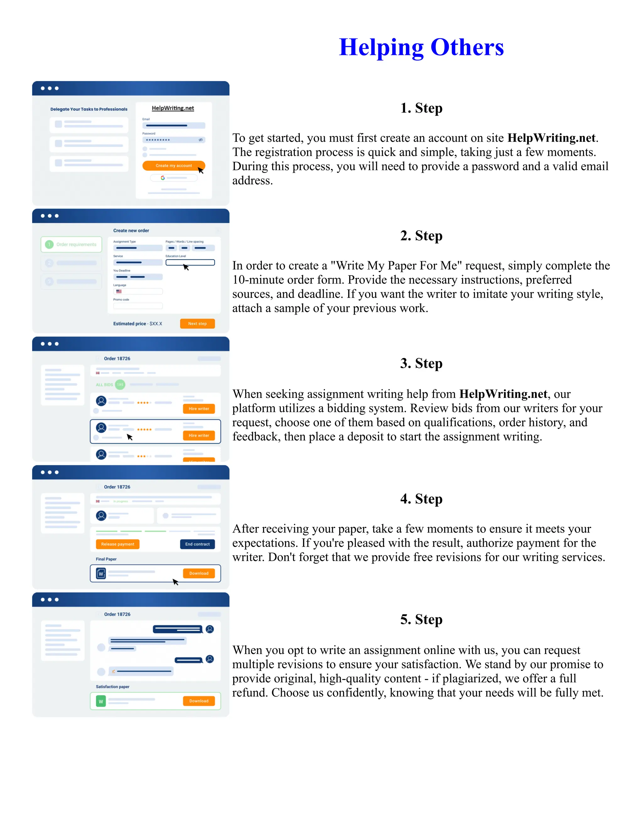 The document outlines five steps to get writing help from HelpWriting.net: