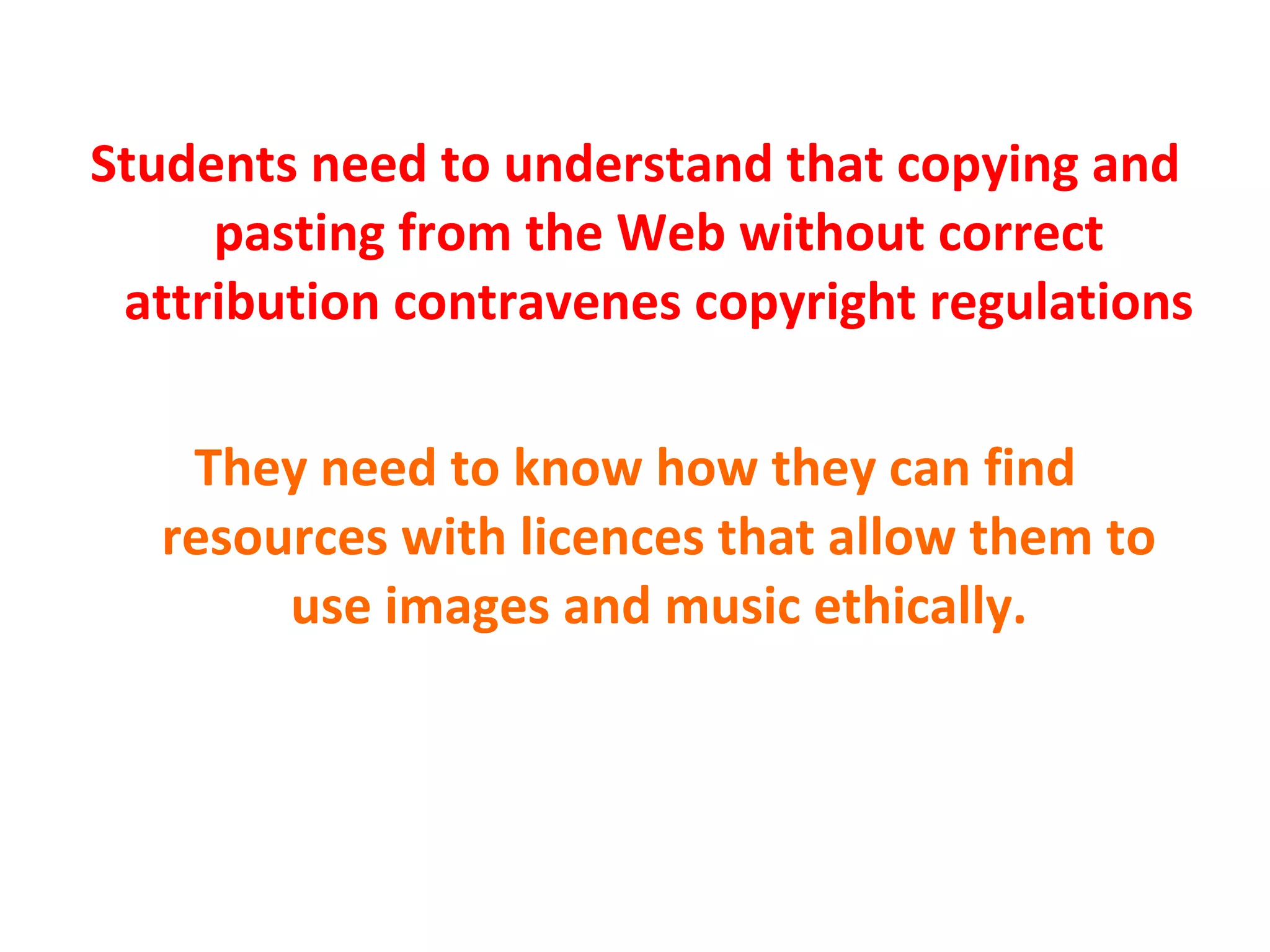 The document discusses the importance of teaching students about using images and music ethically by understanding Creative Commons licenses. It provides definitions of Creative Commons and its various licenses like Attribution, Attribution Share Alike, Attribution Non-Commercial, and Attribution Non-Commercial Share Alike. The document recommends directing students to use the Attribution license which allows others to use, distribute and build upon the work as long as they provide credit to the original creator.