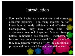 The document discusses developing good study habits in students. It notes that poor study habits are a major cause of academic problems as many students do not know how to study efficiently. It states that developing good study habits requires cooperation between home and school. Some key characteristics of students with poor study habits are that they read quickly without comprehending, are easily distracted, and do not self-discipline well. The responsibility for developing good habits belongs to teachers, students, and parents. Homework can help when done properly but too much or as punishment can be detrimental. Teachers should show students how to study and make homework meaningful.