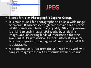 JPG is commonly used for photographs and supports a wide range of colors and high compression ratios while maintaining quality. BMP is an uncompressed format invented by Microsoft that should generally not be used. GIF supports animation and has a limited color palette of 256 colors, making it well-suited for basic images on the internet. TIFF saves high-resolution raster images but results in large file sizes, while PNG also saves in a raster format and is platform independent but may not be compatible with older web browsers.