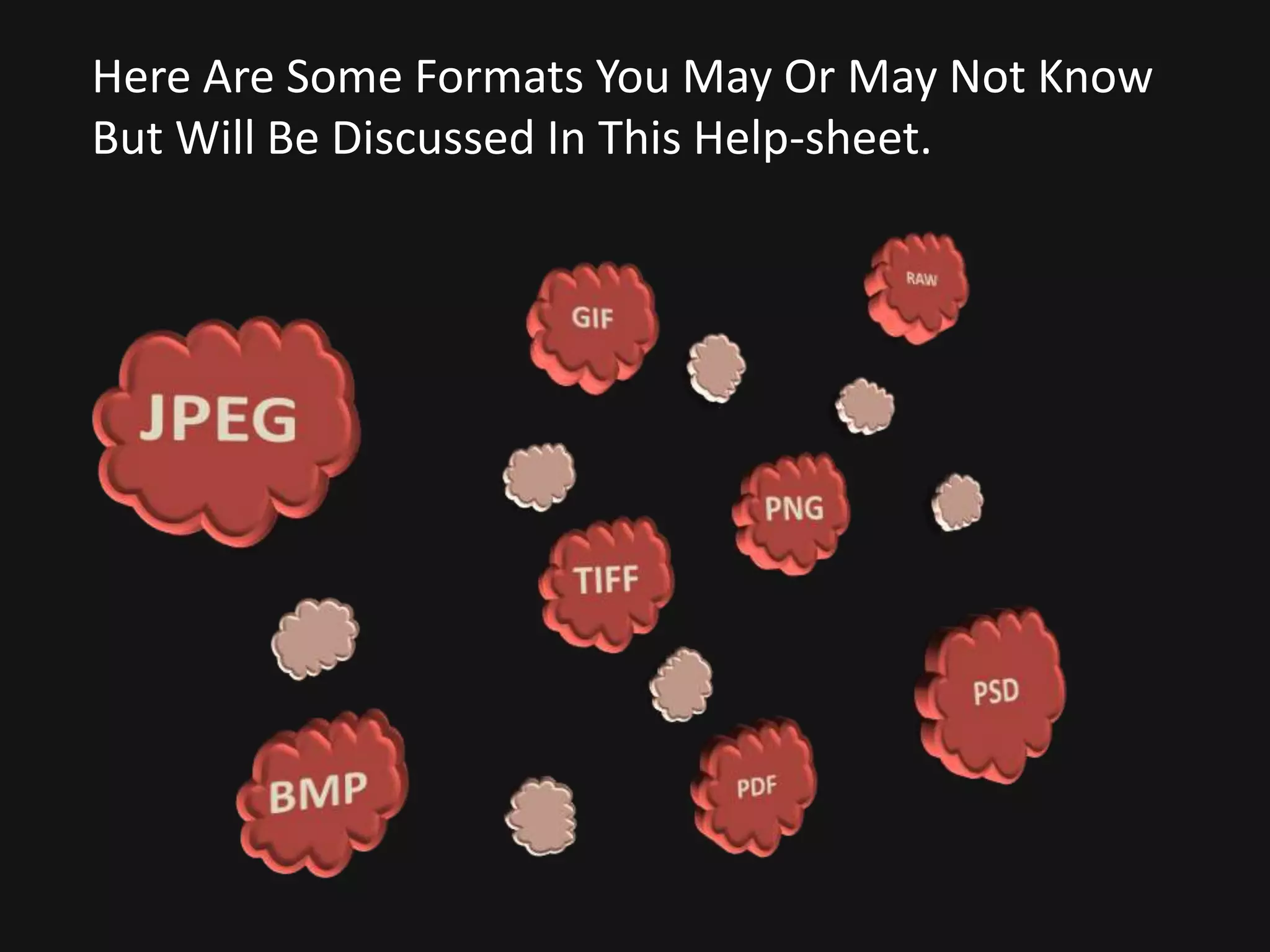 JPG is commonly used for photographs and supports a wide range of colors and high compression ratios while maintaining quality. BMP is an uncompressed format invented by Microsoft that should generally not be used. GIF supports animation and has a limited color palette of 256 colors, making it well-suited for basic images on the internet. TIFF saves high-resolution raster images but results in large file sizes, while PNG also saves in a raster format and is platform independent but may not be compatible with older web browsers.