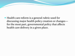 Health care reform in India is handled by the Ministry of Health and Family Welfare, which consists of three departments: Health, Family Welfare, and AYUSH. The goal of health care reform is to make health care more accessible and available to all citizens by providing universal health coverage, decreasing costs, and improving access and quality. However, India faces challenges in reforming its health care system due to issues like a lack of infrastructure and medical professionals in rural areas, as well as underfunding and malnutrition among parts of the population. Overall reforms are needed to make the health care system more inclusive, preventive-focused, and sustainable over the long term.