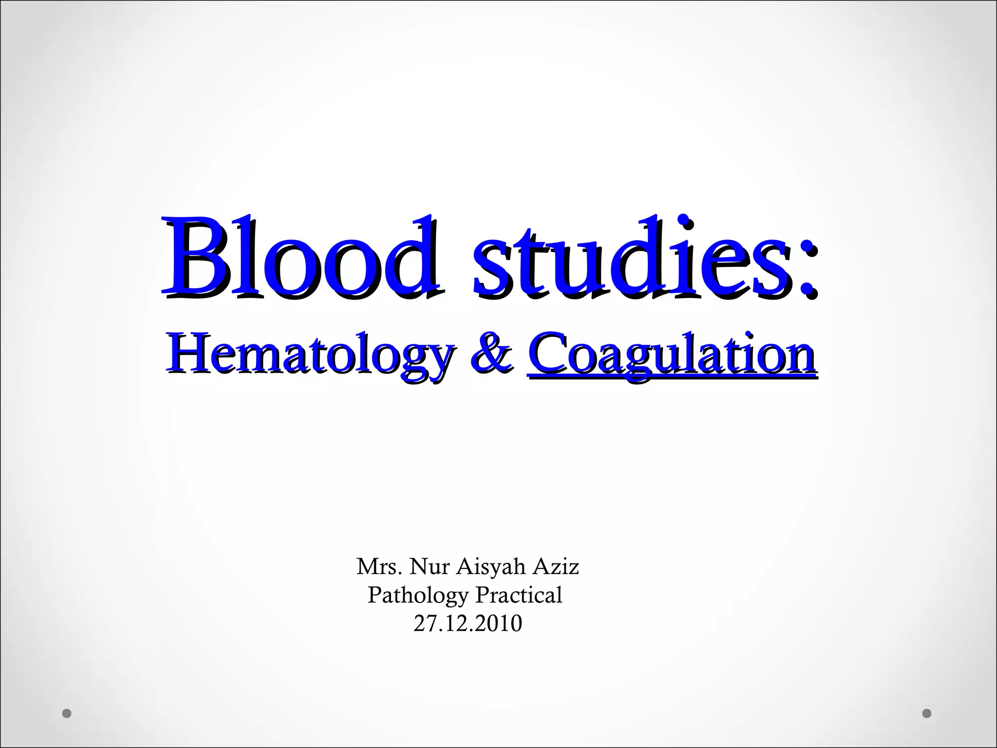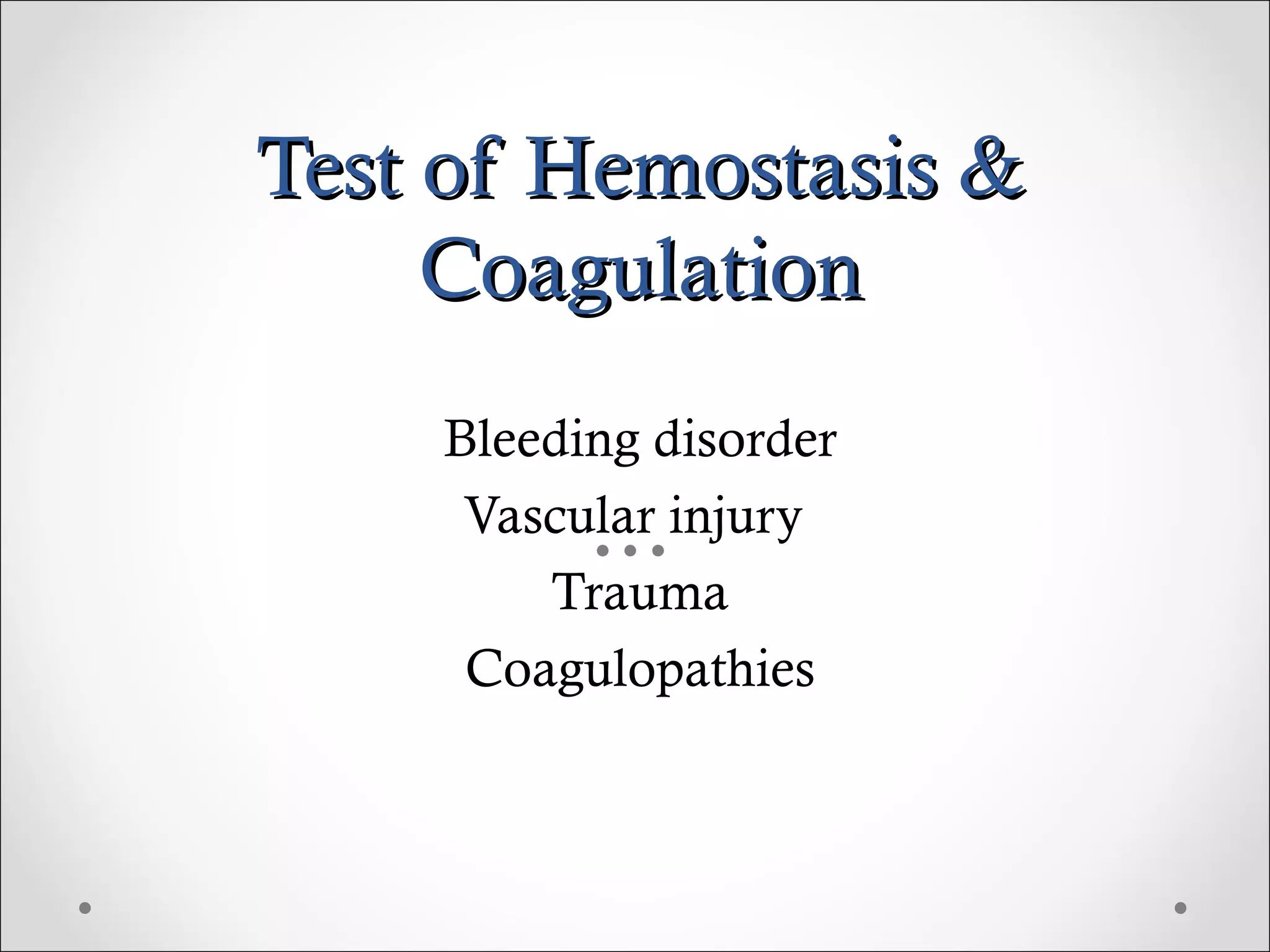 This document discusses various laboratory tests used to investigate hemostasis and coagulation disorders. It outlines five primary screening tests, including platelet count, bleeding time, prothrombin time (PT), partial thromboplastin time (PTT), and fibrinogen level. More specific coagulation factor assays and tests of fibrinolysis are also mentioned. Details are provided on procedures for common coagulation tests like PT, PTT, thrombin time (TT) and activated coagulation time (ACT). The document discusses the clinical implications of abnormal results and potential interfering factors for interpretation.