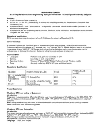 M. Hemantha Gokhale has over 5 years of experience testing WLAN, Bluetooth, FM, and NFC power and developing device drivers and mobile applications. He has a B.E. in Computer Science and Engineering and is proficient in C, Perl, and Linux. His experience includes power testing automation, driver development, and creating mobile games and media streaming applications. He is seeking a software engineering role utilizing his skills in networking, scripting, and embedded systems.