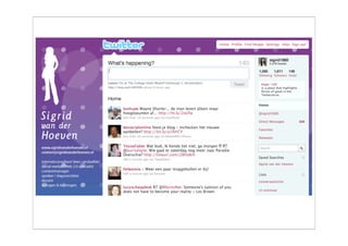 Twitter = in 140 karakters vertellen wat je bezighoudt ✓ Altijd en overal via computer, chat & mobiel ✓ Microbloggen, chatten en lifestream in één ✓ Twitter = inspiratie, observaties, ingevingen, connecties, netwerken, informatie, nieuws, communicatie, kennisdeling, input, hulp, publiceren, experimenteren