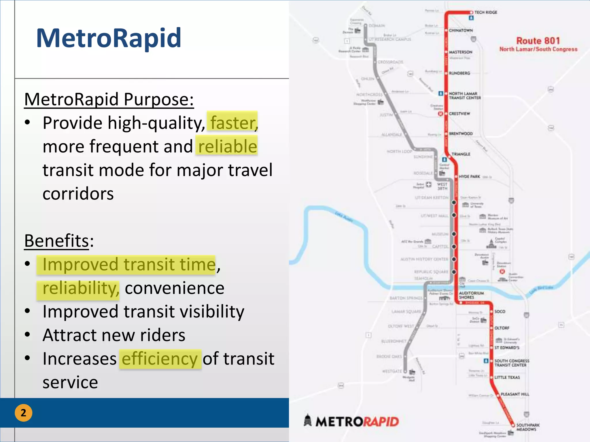 The document discusses the MetroRapid transit signal priority (TSP) system implemented by Capital Metro to enhance bus service quality in Austin, Texas. It outlines the benefits of TSP such as improved travel times and reliability, as well as the system's operational details and current performance challenges. Future efforts will focus on data analysis to optimize TSP operations and improve overall transit efficiency.