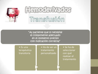 Este documento presenta información sobre diferentes componentes sanguíneos y sus usos terapéuticos. Describe sangre completa, concentrado globular, concentrado de plaquetas, plasma fresco congelado, crioprecipitado, albúmina e inmunoglobulinas, incluyendo sus descripciones, indicaciones, contraindicaciones, dosificaciones y formas de administración. También discute posibles reacciones adversas a las transfusiones y cómo manejar una reacción hemolítica aguda.