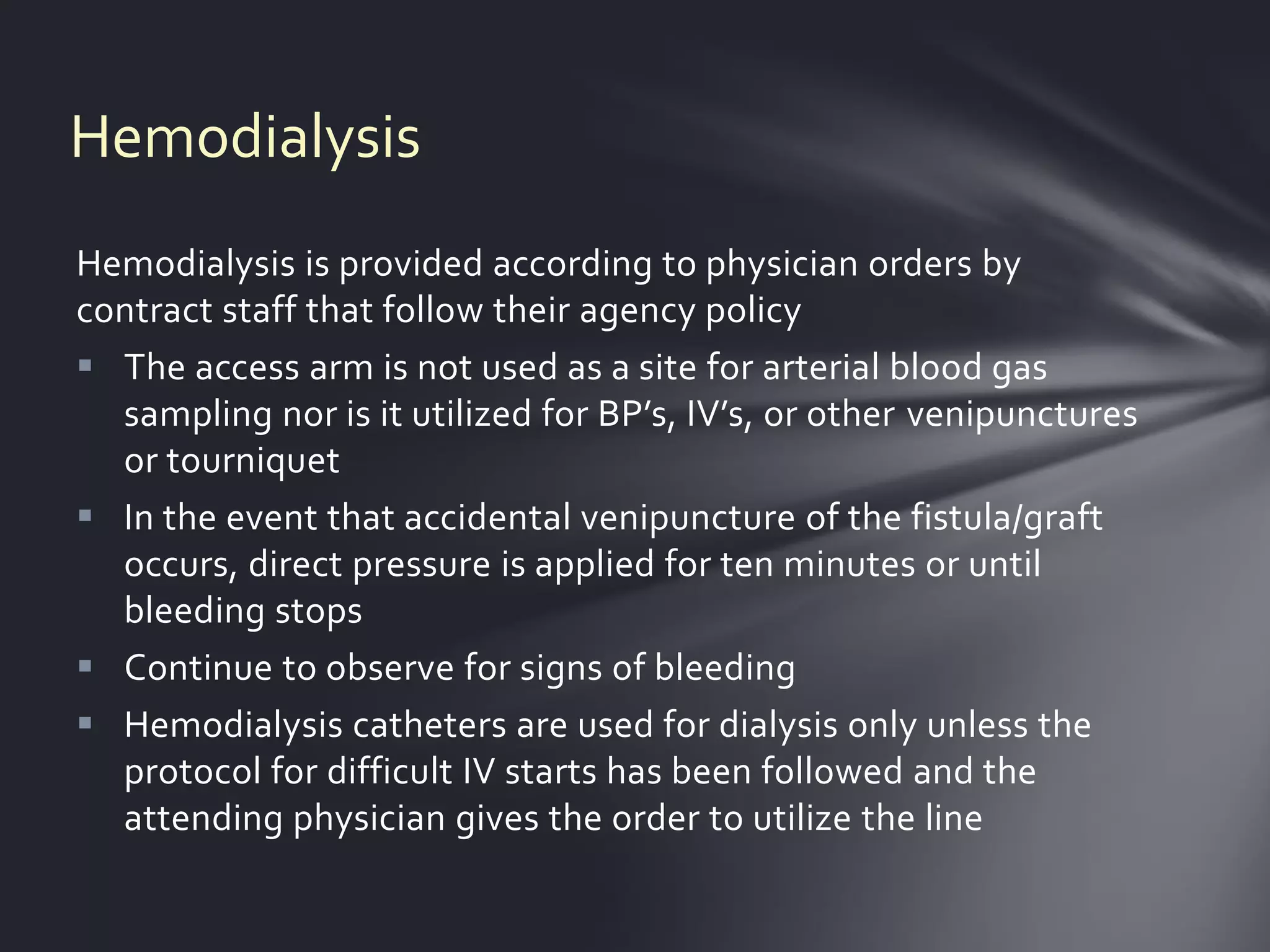 This document outlines guidelines for providing hemodialysis treatment, including: only using the access arm for dialysis and applying direct pressure for bleeding; using catheters only for dialysis unless otherwise ordered; postponing routine meds before/after dialysis unless ordered; avoiding IM meds/IVs for 3 hours after; weighing patients daily and prohibiting access arm procedures; and observing patients during and after treatment for adverse reactions.