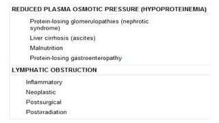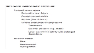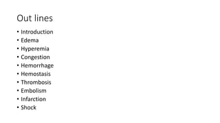 This document provides an overview of hemodynamics disorders and outlines various pathologies including edema, hyperemia, congestion, hemorrhage, hemostasis, thrombosis, embolism, and infarction. It discusses the normal balance of fluid movement across capillaries and how various pathologic conditions can disrupt this balance and cause edema. Key concepts covered include the Starling forces, categories of edema, factors influencing thrombosis, and the coagulation cascade. Morbidities associated with cardiovascular diseases are also briefly mentioned.