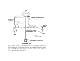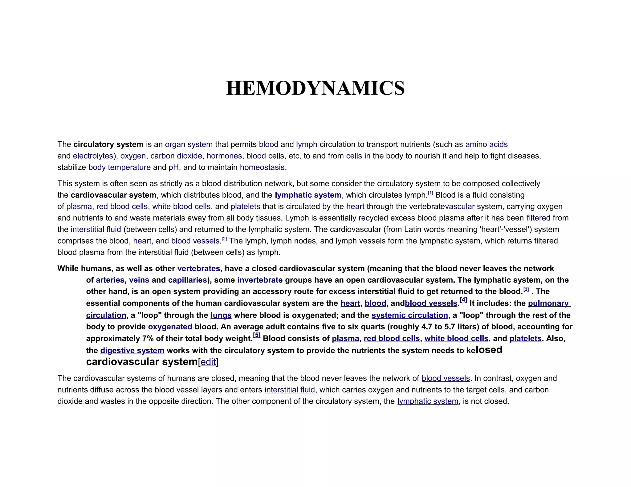 The circulatory system transports blood, nutrients, oxygen, hormones, and other materials throughout the body. It consists of the cardiovascular system, which circulates blood, and the lymphatic system, which circulates lymph. Blood is pumped from the heart through arteries and returns to the heart through veins. The lymphatic system returns filtered blood plasma from tissues as lymph. Hemodynamics refers to the study of blood flow and circulation. Key factors that influence blood flow include blood pressure, vessel diameter, blood viscosity, and respiration.