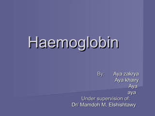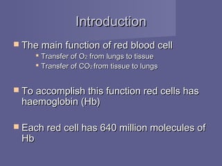 Haemoglobin is the protein in red blood cells that transports oxygen and carbon dioxide throughout the body. It is composed of four globin protein subunits, each containing an iron-containing heme group. Haemoglobin's ability to bind and release oxygen and carbon dioxide allows it to deliver oxygen from the lungs to tissues and remove carbon dioxide from tissues back to the lungs. Several factors regulate haemoglobin's affinity for oxygen, including partial pressures of oxygen and carbon dioxide, pH, and levels of 2,3-bisphosphoglycerate in the blood. This complex regulation allows haemoglobin to efficiently load and unload gases where they are needed.