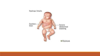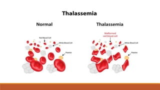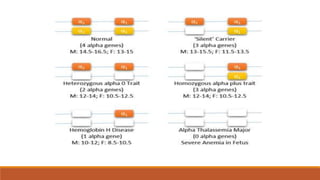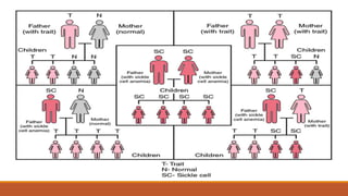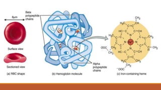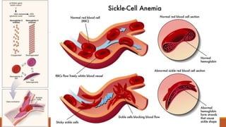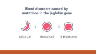 Hemoglobinopathies are disorders of hemoglobin structure or synthesis. The document discusses hemoglobin structure and function, as well as two main types of hemoglobinopathies: sickle cell anemia and thalassemia. Sickle cell anemia is a structural disorder caused by a mutation resulting in abnormal hemoglobin S, which causes red blood cells to sickle and break down early. Thalassemia is a disorder of hemoglobin synthesis, where there is reduced or absent alpha or beta globin chain production leading to anemia. Common symptoms, inheritance patterns, and treatments are described for both conditions.