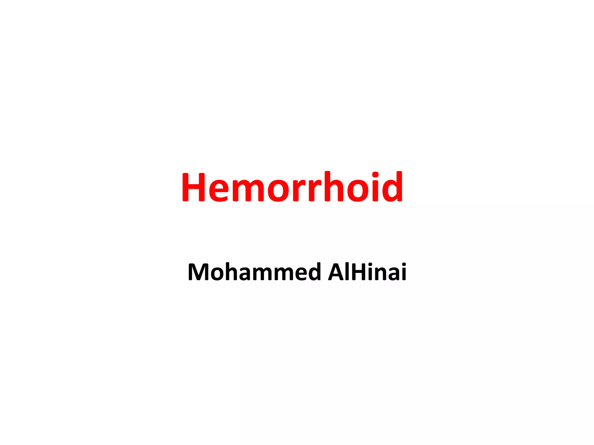 This document discusses hemorrhoids, including their anatomy, classification, risk factors, pathogenesis, clinical features, diagnosis, differential diagnosis, and management. Some key points: