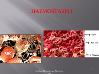 The document covers the topic of haemostasis, defining it as the prevention of blood loss through the formation of clots in damaged blood vessels. It outlines the main mechanisms involved, including vascular spasm, platelet reaction, platelet plug formation, and blood coagulation, as well as the role of platelets and coagulation factors. Key points include the physiological processes of platelet adherence and activation, leading up to the ultimate formation of fibrin from fibrinogen.