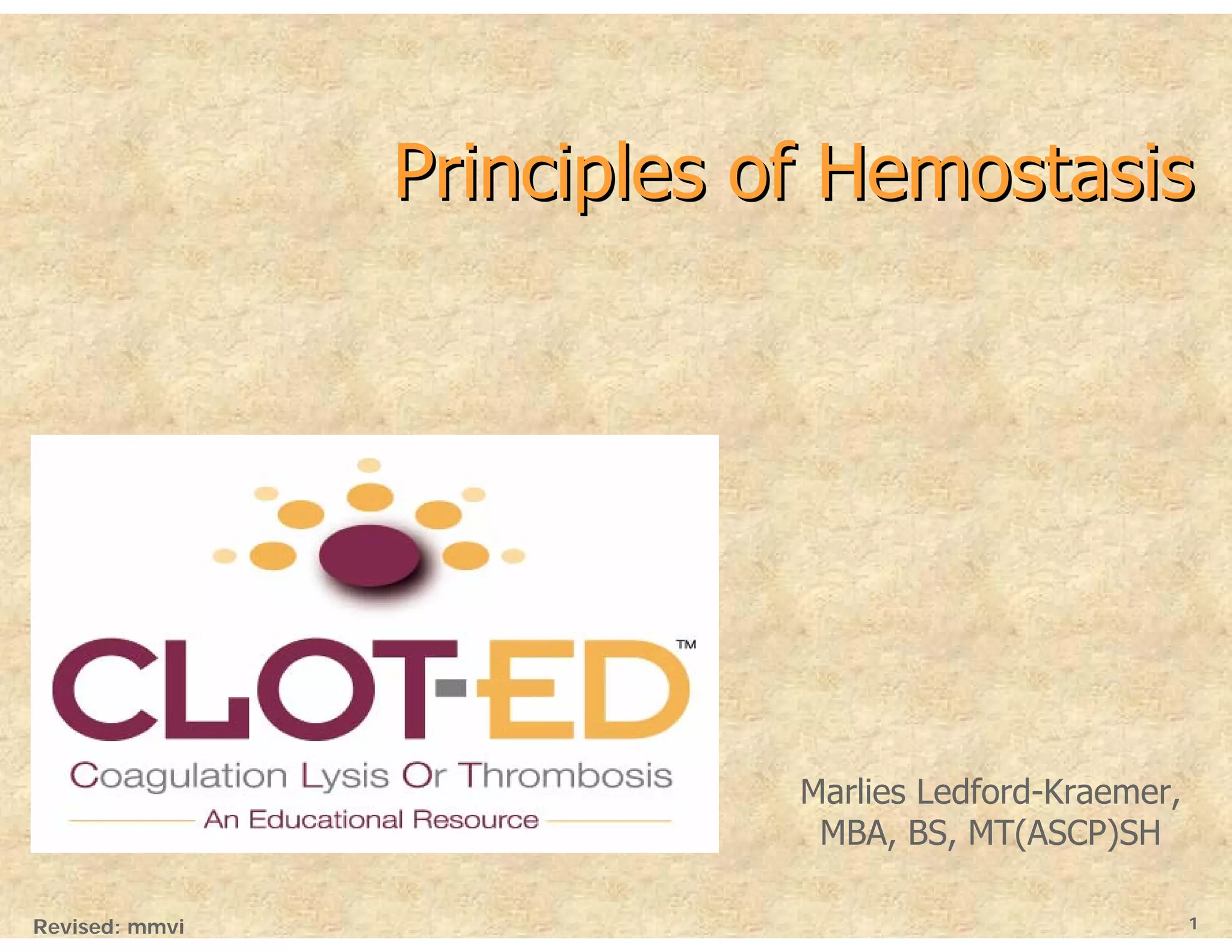 This document provides an overview of principles of hemostasis. It begins with an introduction and discusses Virchow's triad, which describes the three main factors that influence blood coagulation: changes in blood vessels, blood flow, and blood components. Primary hemostasis mediated by platelets is described. Secondary hemostasis and the coagulation cascade are then explained. Laboratory tests for evaluating hemostasis are also summarized. The document concludes with sections on vitamin K antagonists and the anticoagulant warfarin.
