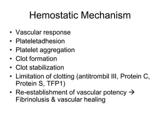 This document discusses hemostasis disease in children, specifically focusing on immune thrombocytopenia (ITP). It describes the mechanisms, clinical presentation, diagnostic evaluation, and treatment approaches for ITP. Key points include that ITP is characterized by low platelet count due to increased platelet destruction by autoantibodies, with symptoms of bruising and bleeding. Evaluation involves blood tests to confirm thrombocytopenia and exclude other causes, while treatment may include corticosteroids, IVIG, or splenectomy in severe cases.