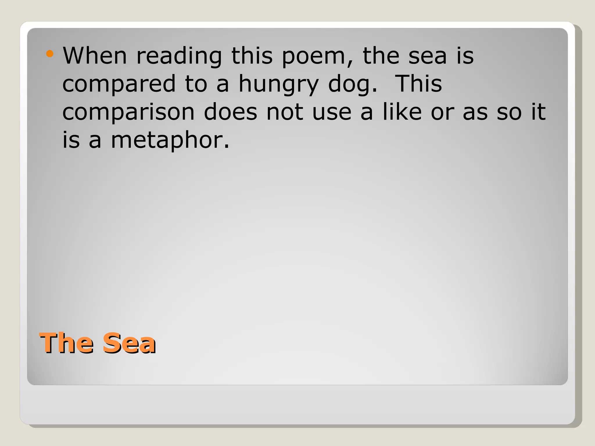 The document discusses a poem called "The Sea" through analyzing several lines and literary devices used. It notes that the sea is compared to a hungry dog through a metaphor. Several words like "gnaw", "rumbling", and "tumbling" depict the waves wearing away the shore. The poem uses onomatopoeia through the words "sniffs" and "snuffs" and compares dune grasses to a musical instrument that is no longer playing its tune. The weather controls the sea's behavior in the poem and it depicts the sea as a powerful force through playful language.