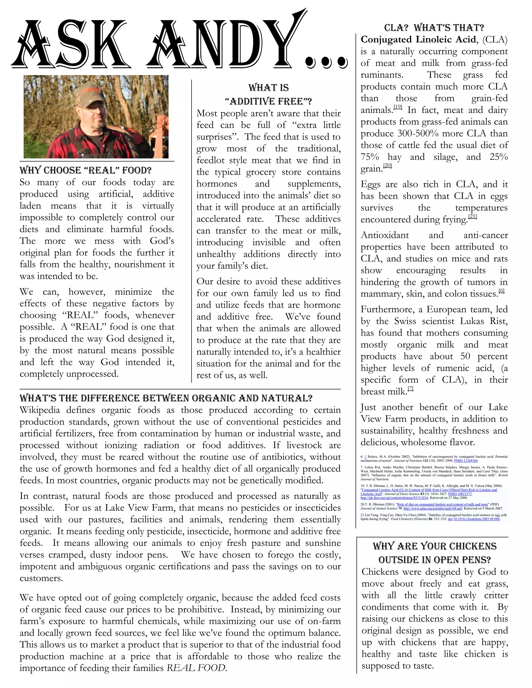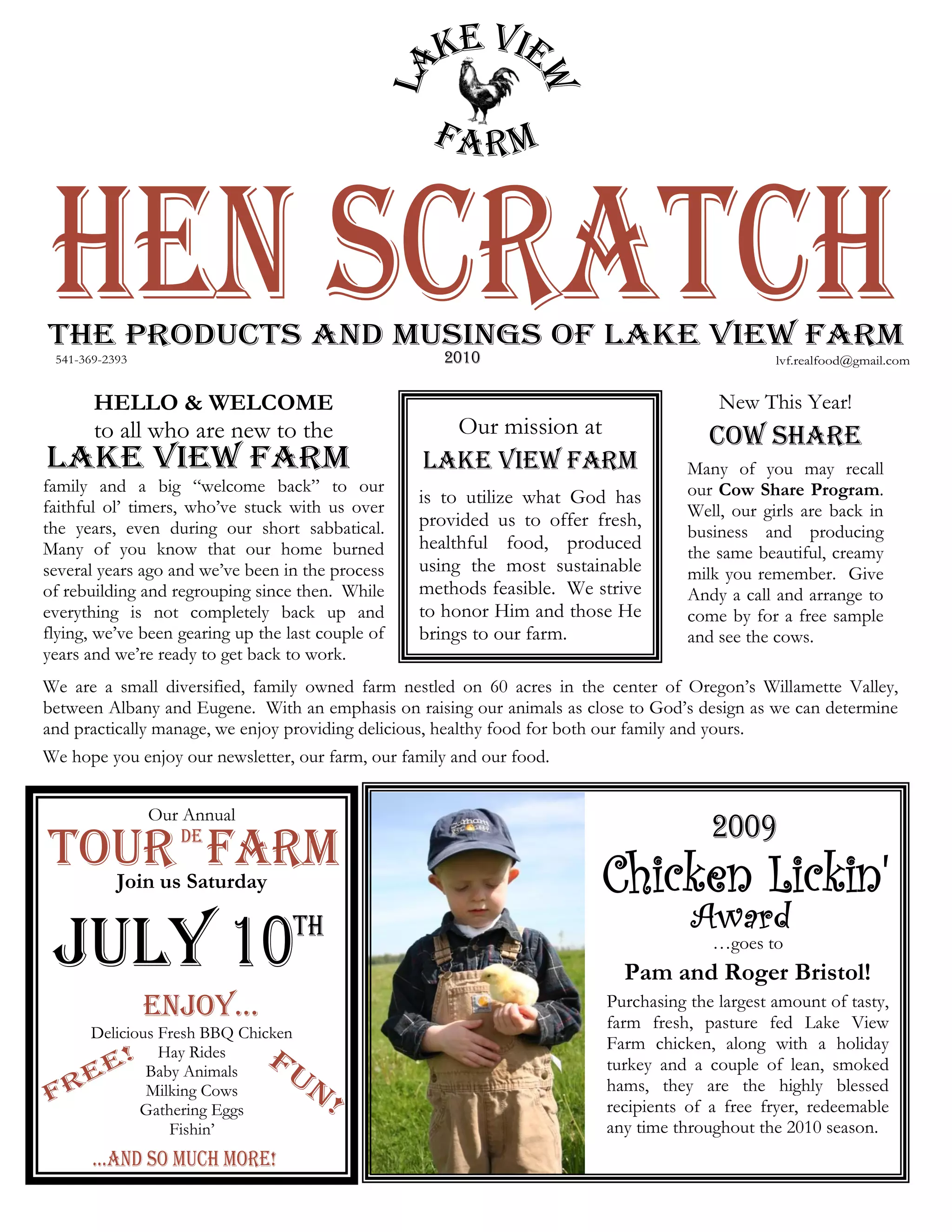 Lake View Farm is a family-owned farm in Oregon committed to providing fresh, healthy, and natural food products while avoiding additives and harmful chemicals. The farm emphasizes sustainable practices, offering a variety of products such as grass-fed beef, pasture-raised chicken, and fresh eggs, all produced under humane conditions. Despite legal constraints preventing the sale of raw dairy, the farm invites customers to participate in its cow share program and encourages feedback on their products.
