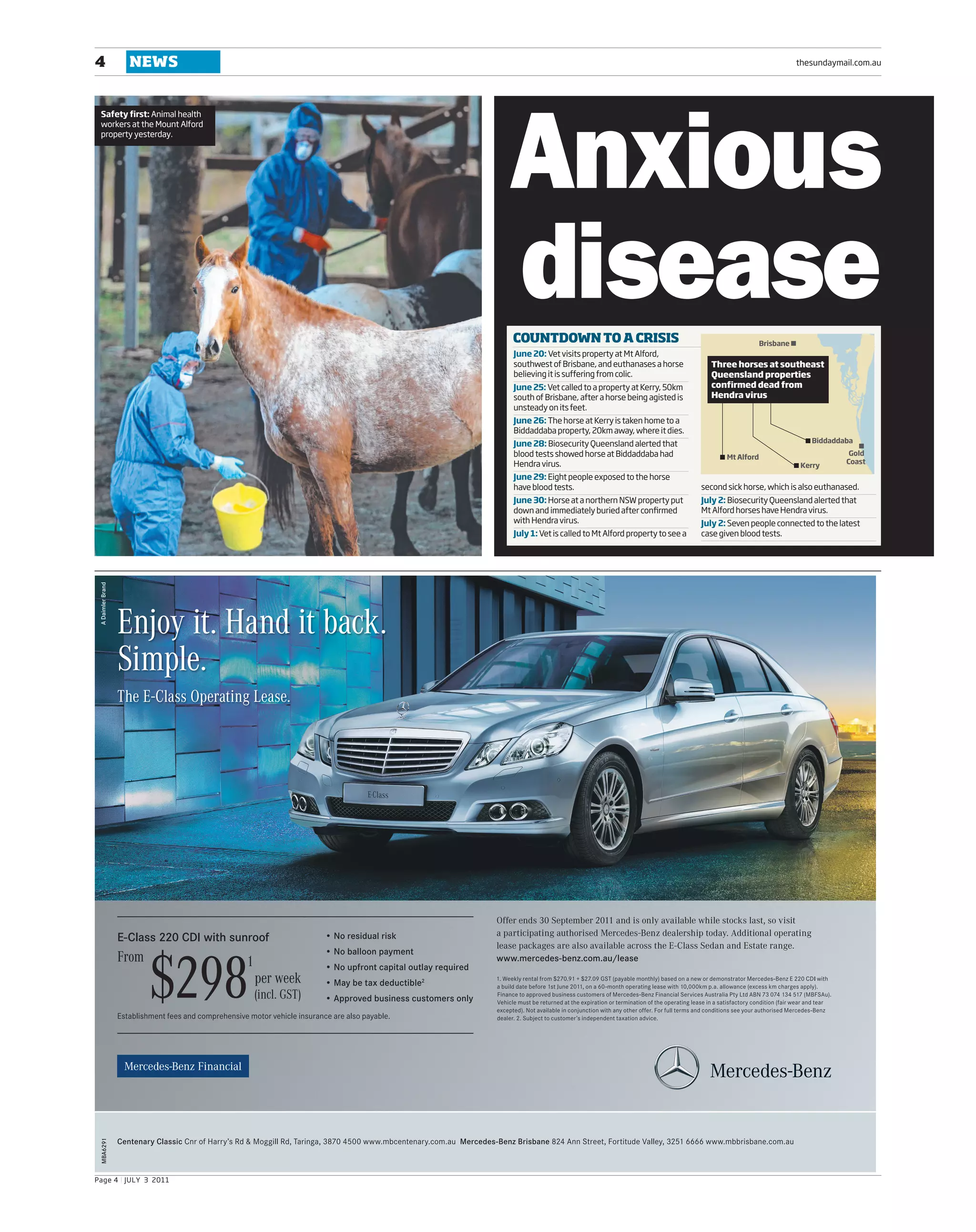 Three horses on separate properties in southeast Queensland were confirmed dead from Hendra virus in late June 2011. A timeline shows that a vet first euthanized a horse at a property near Brisbane on June 20th believing it had colic. This was followed by another sick horse at a separate property that was taken to a third property where it died. Blood tests later confirmed the horse had Hendra virus. Additional horses then became sick and were euthanized at the first property, with blood tests confirming Hendra virus in those cases as well. People exposed at the various properties were monitored with blood tests.