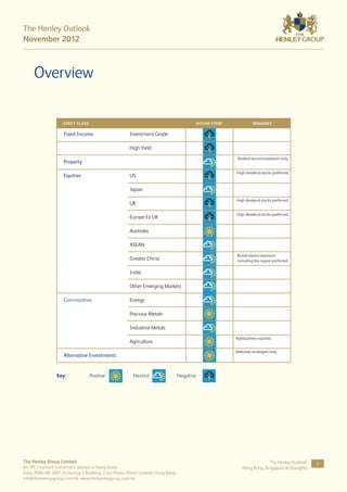 The document provides an overview of the global economic and political outlook for November 2012. It notes that the next few months could see significant changes or events, as issues in the US, China, Europe and elsewhere may be coming to a head. The outlook remains uncertain, as America faces its "fiscal cliff" and debt ceiling, China transitions to new leadership, and debt problems continue to threaten Greece, Spain and the eurozone more broadly. However, the IMF may be preparing for reforms to the broken monetary system by revisiting an alternative proposed in the 1930s.