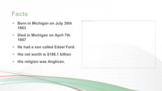 Henry Ford was an American industrialist born in 1863 in Michigan who is renowned for revolutionizing the automobile industry. He is best known for founding the Ford Motor Company and developing the assembly line technique of mass production, which allowed him to produce the affordable Model T car for the American middle class on a large scale. Ford also pioneered the $5 per day wage for his workers, which was an unprecedentedly high wage at the time. He remained actively involved in his company until his death in 1947 at the age of 83 in Michigan.
